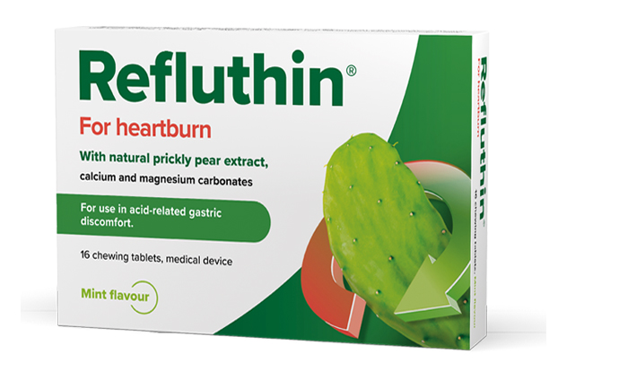 Die neuen Refluthin® Kautabletten wirken gleich zweifach bei Sodbrennen: Mineralische Säurepuffer lindern schnell säurebedingte Magenbeschwerden wie Sodbrennen und saures Aufstoßen. Die hochkonzentrierten Inhaltsstoffe aus pflanzlichem Feigenkaktusextrakt beruhigen und schützen gleichzeitig die Schleimhaut der Speiseröhre auf natürliche Weise.